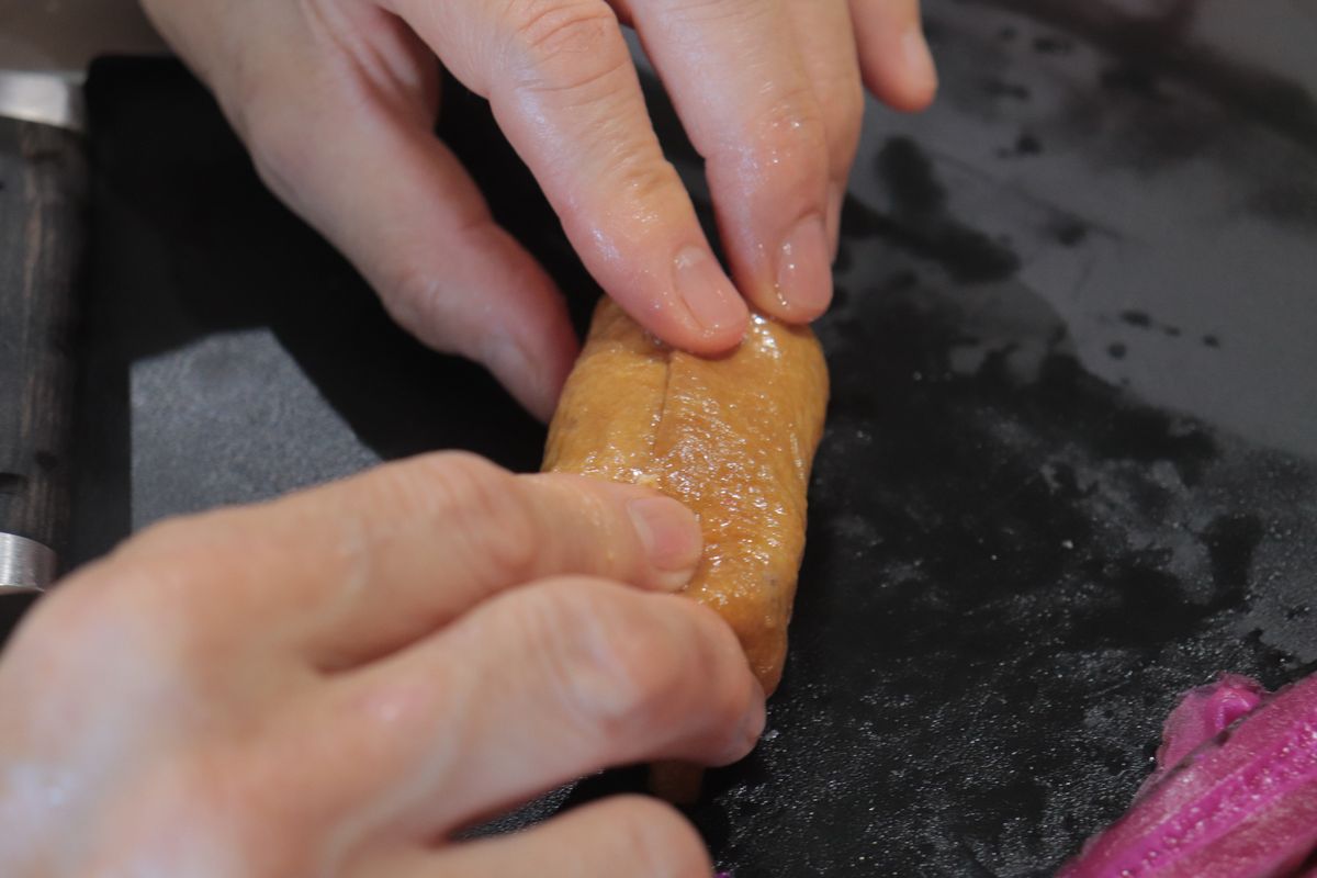 2.しっかり水気を絞ったすしあげの中に1でカットしたキュウリとしば漬け、卵焼き、カニカマ、大葉を詰める