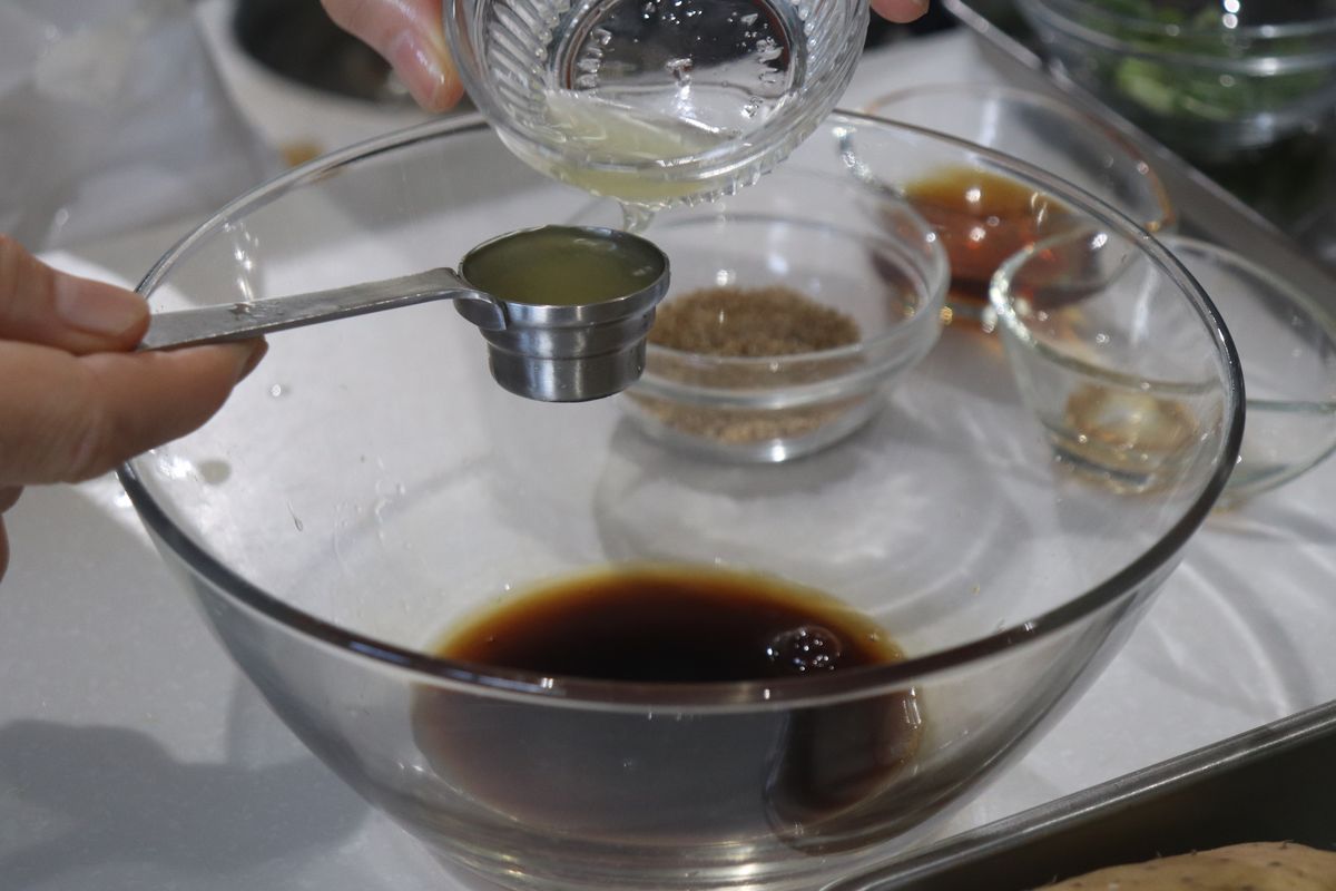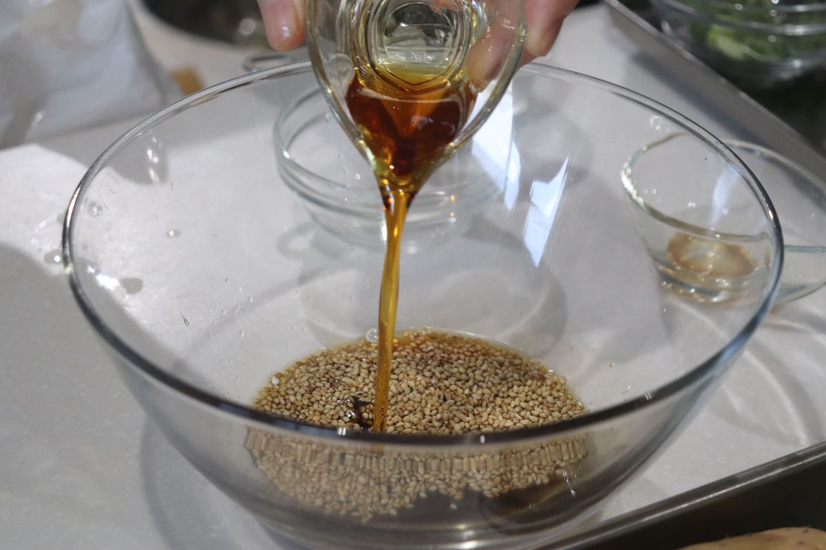 2.1にごまとごま油を入れて、よく混ぜる。これでタレは完成!