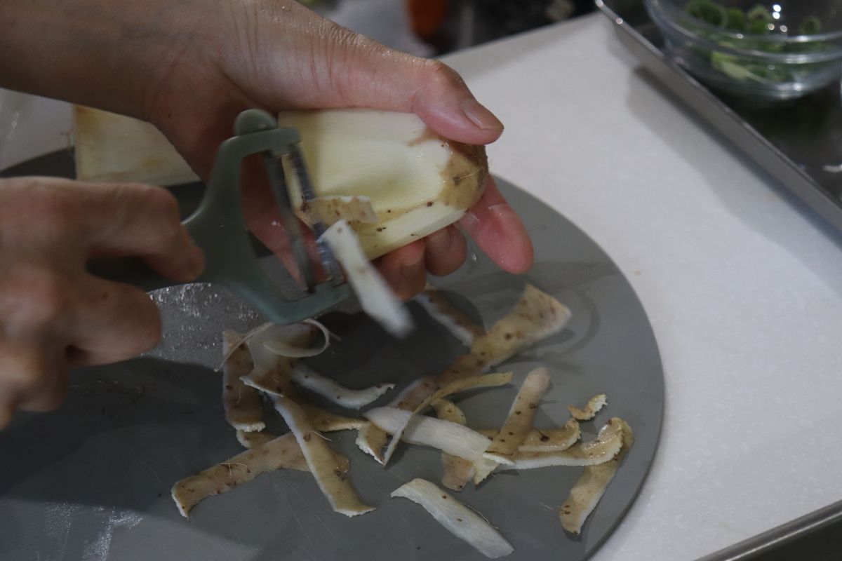 4.山芋の皮をピーラーでむいて、断面や根っこの部分は切り落とす