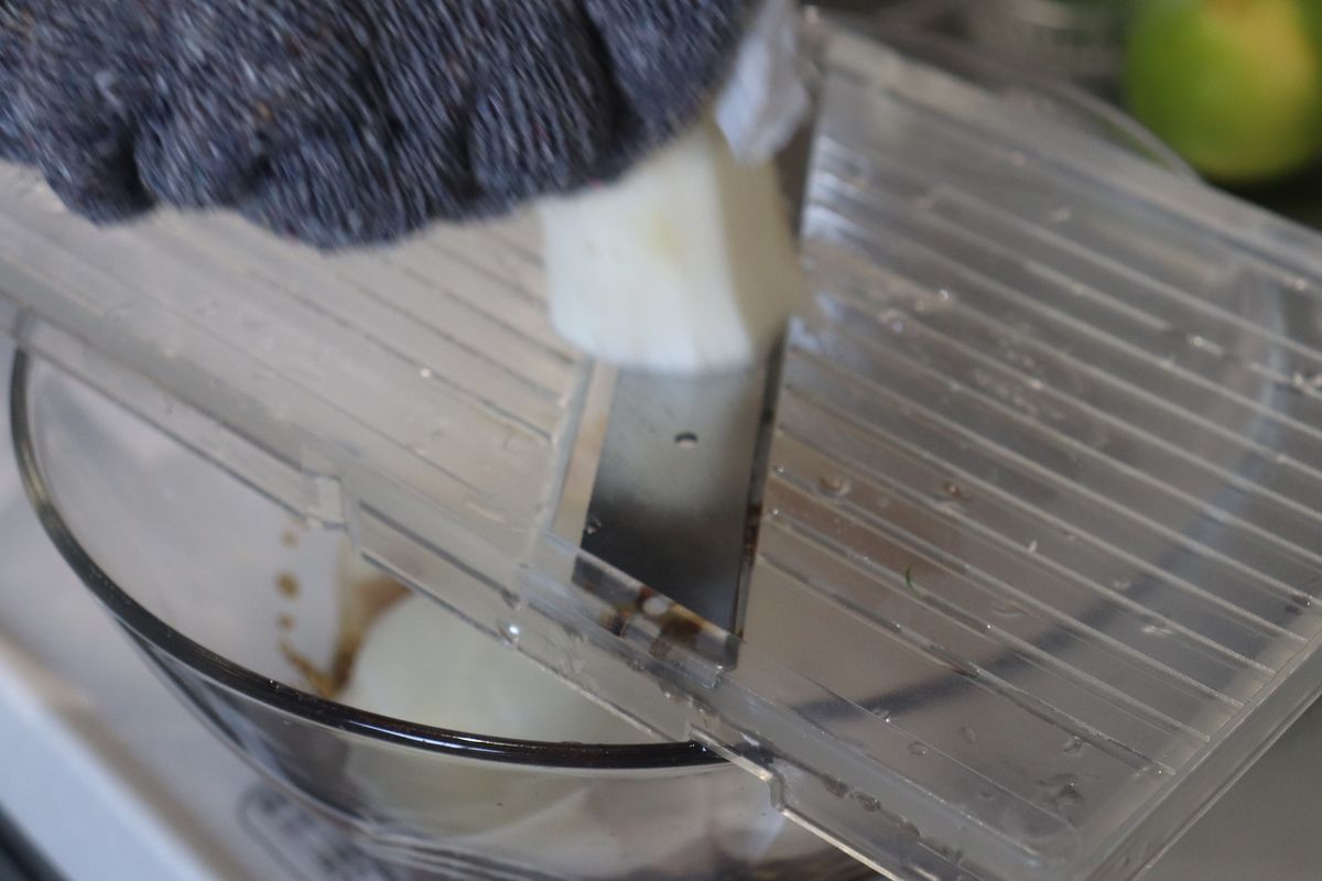 5.タレが入ったボウルの上にスライサーを置いて、山芋をスライスする