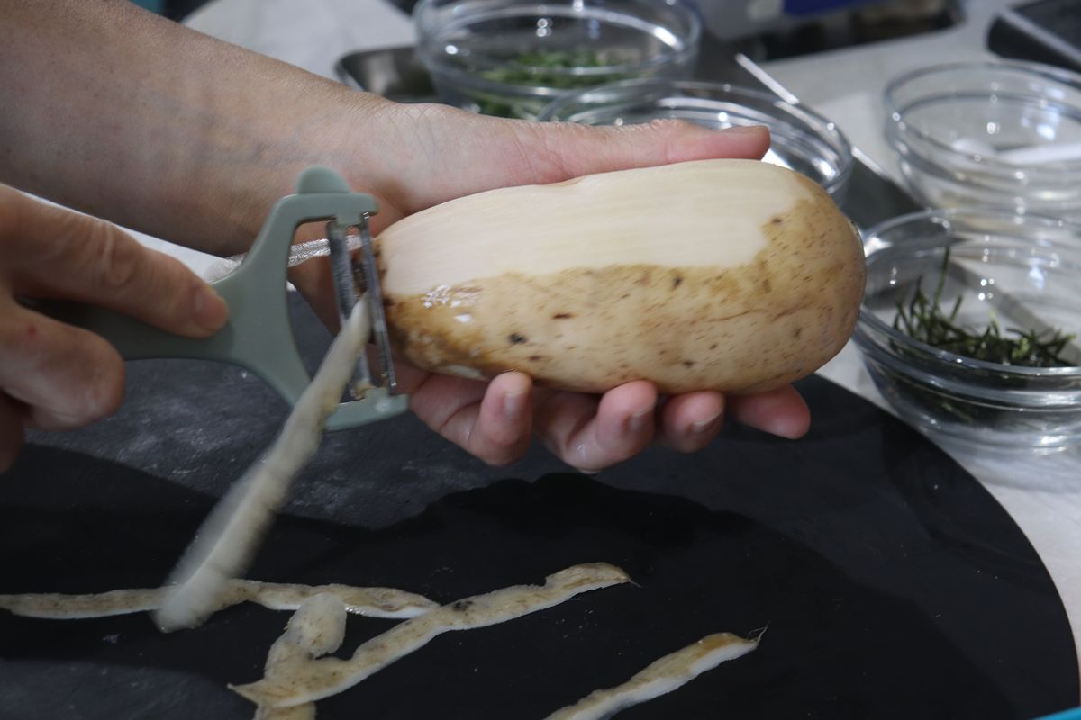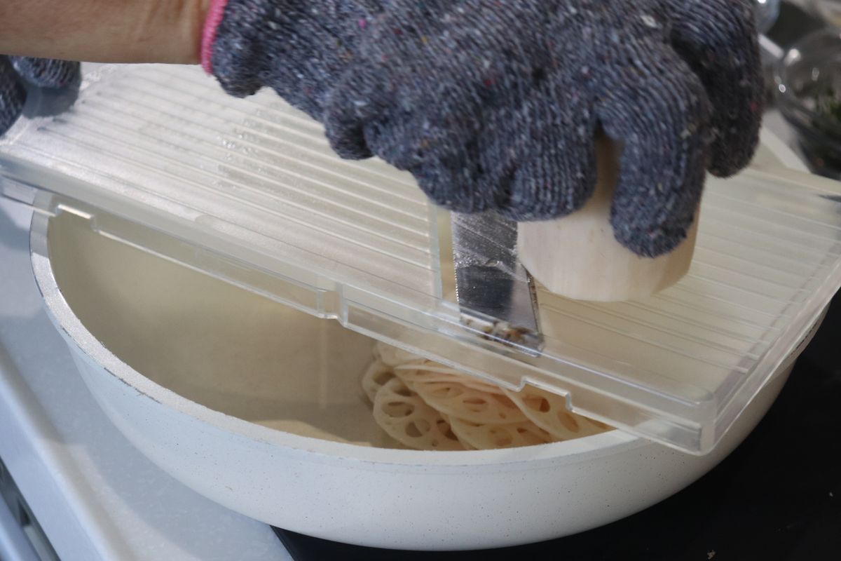 2.フライパンの上にスライサーをのせて、レンコンをスライスする