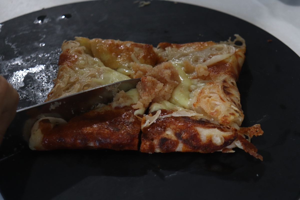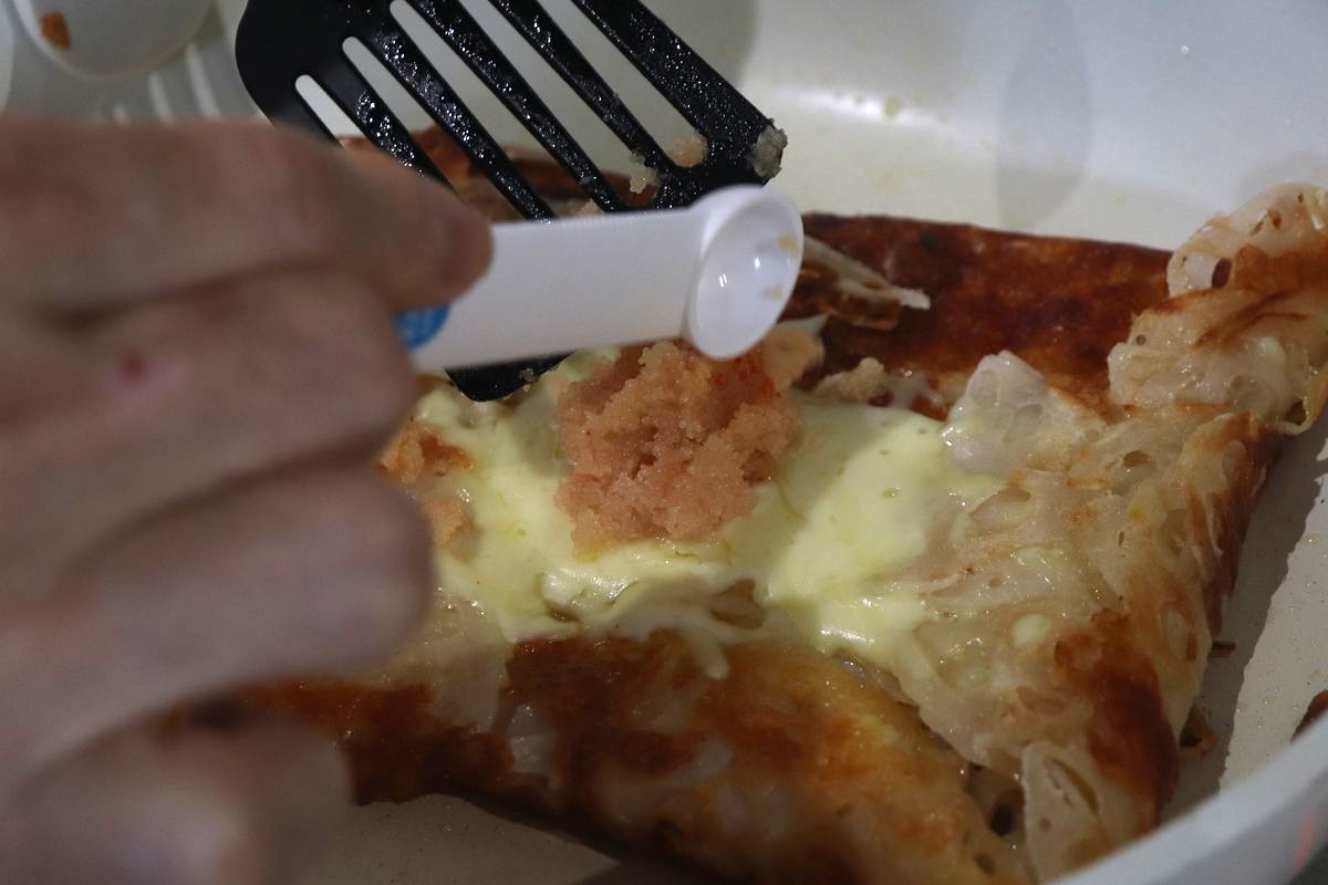 7.折りたたんだら、温かいうちにシュレッドチーズと明太子を中心に乗せる