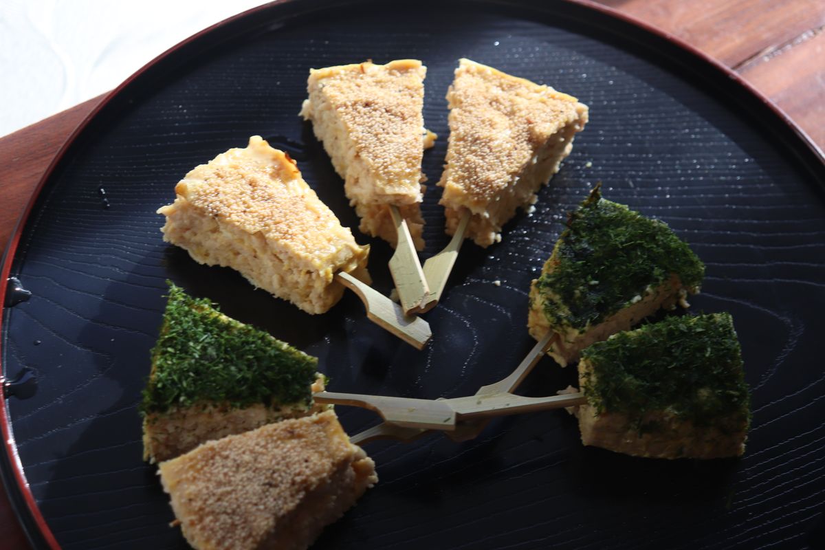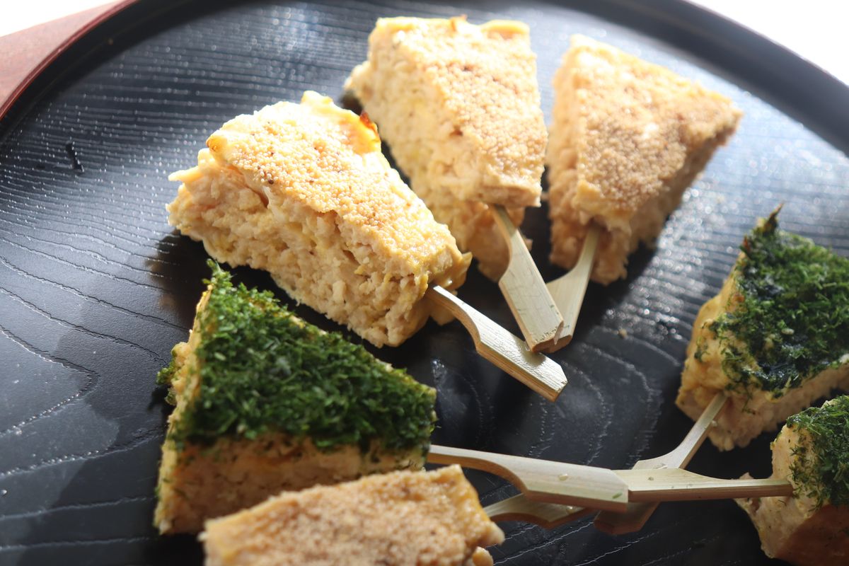 10.9で切った半分に青のりをかけて、扇形に切り串を刺して、盛り付けたら完成!
