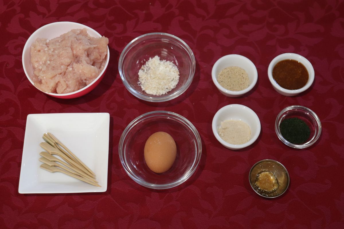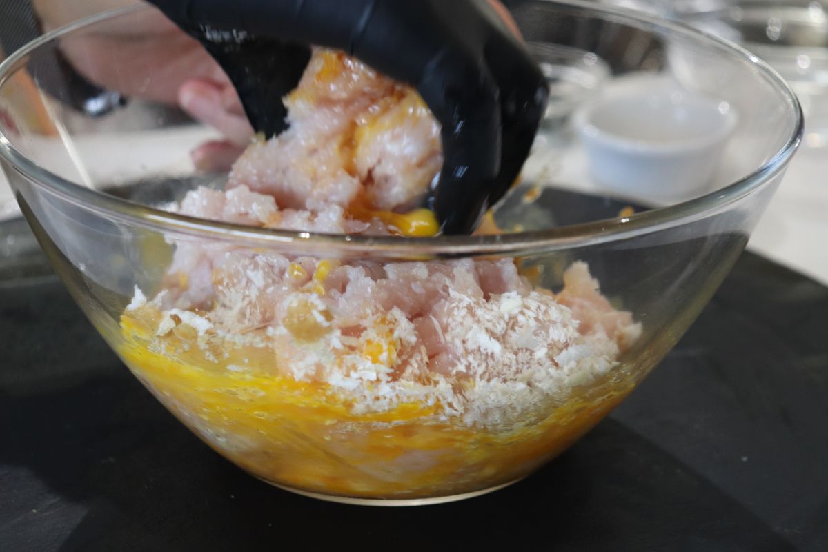 3. ボウルに鶏ひき肉、醤油麹(または醤油)、しょうが、砂糖、パン粉、卵を入れ、手でもみ込む