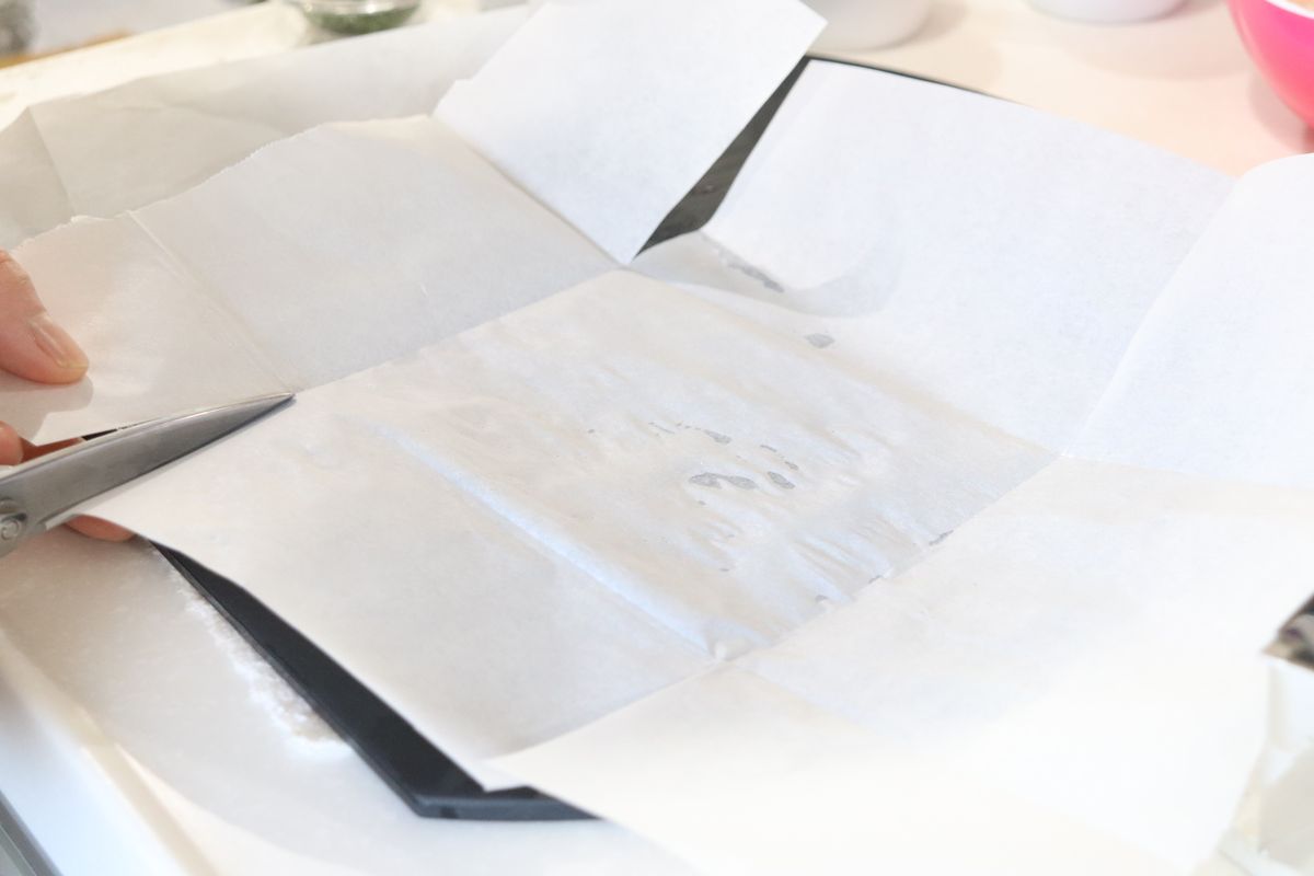 1.下準備をします!クッキングシートを型の底の大きさに合わせて折り、四隅に切り込みを入れる