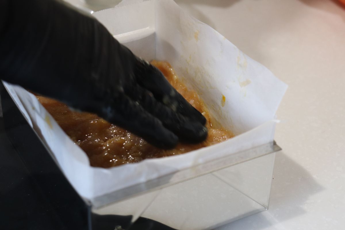 4. 粘りが出るまでよくもんだら、型に入れて平らにならし、空気を抜くため、型を台にトントンと軽く打ちつける