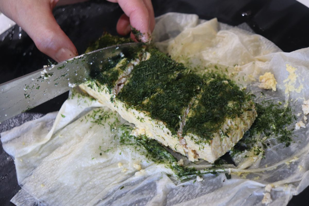 2.切ったら型に敷く。※少し小さめにすると仕上がりがきれい