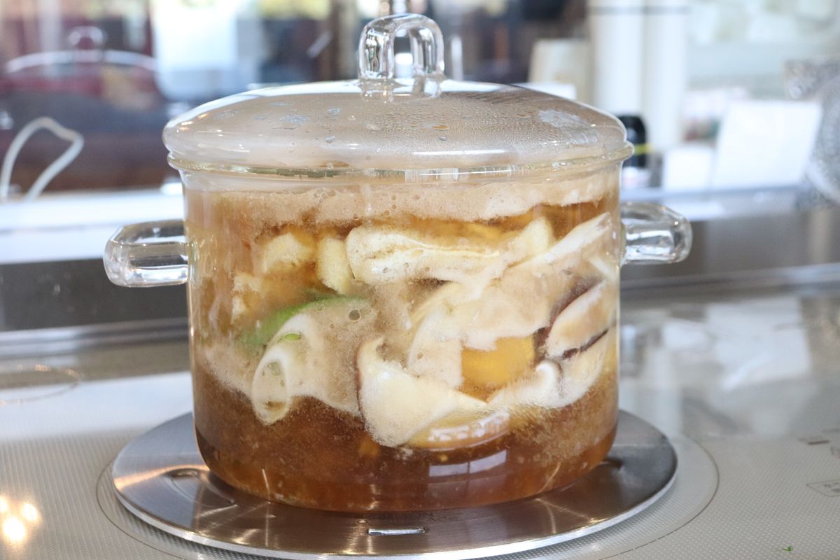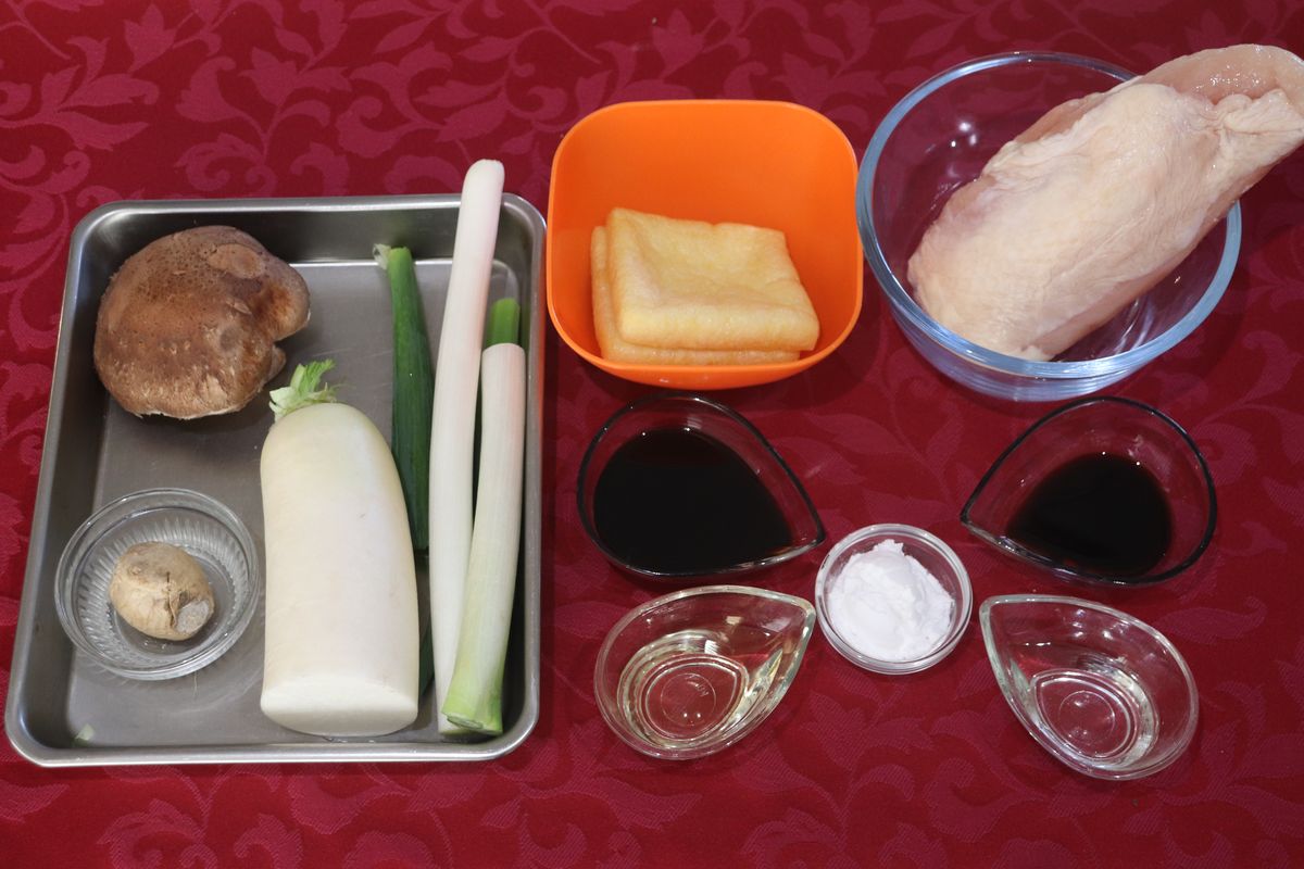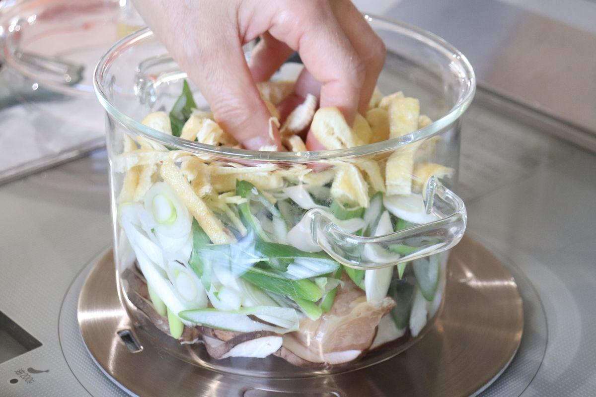 6.鍋に、しいたけ→鶏肉→長ねぎ→生姜→油揚げの順で入れる