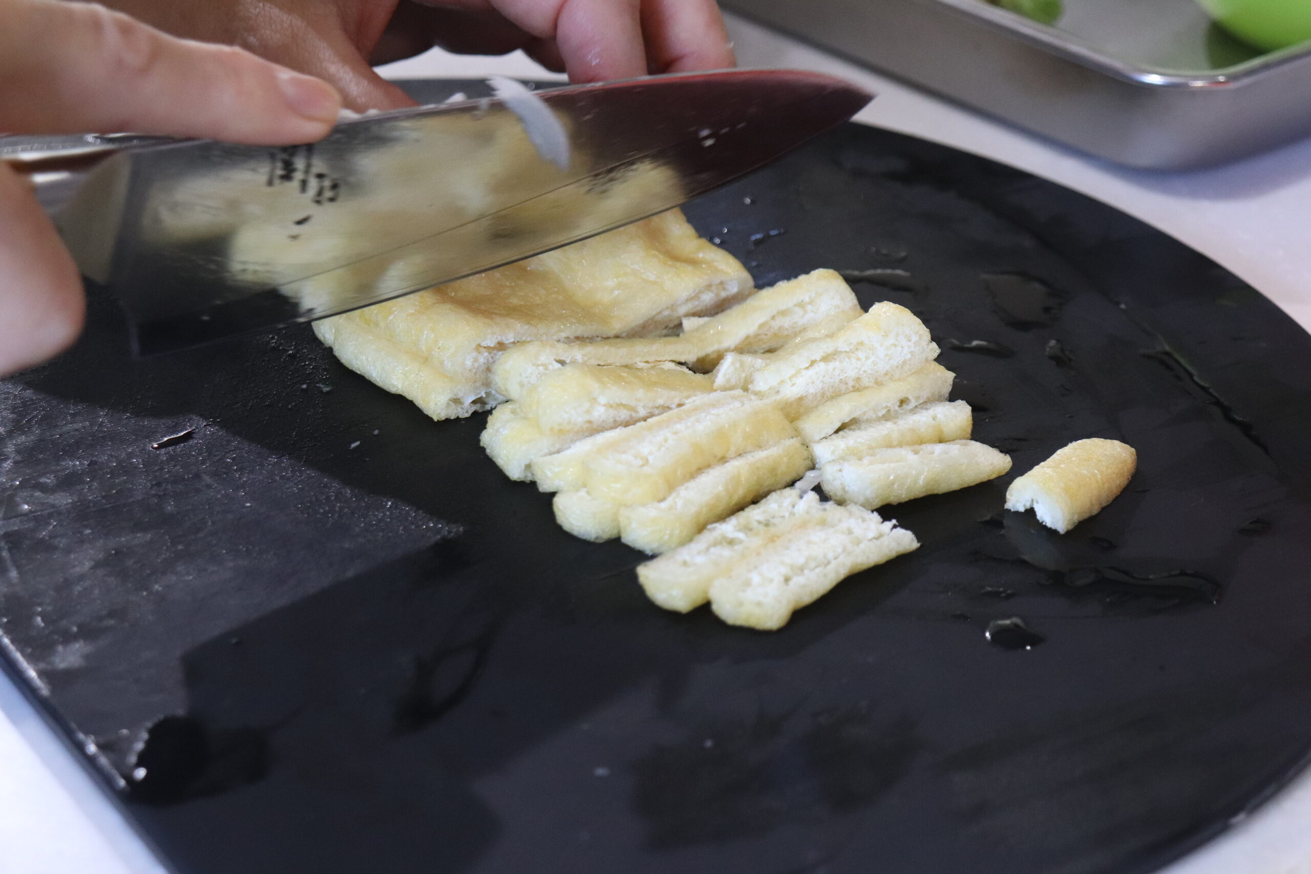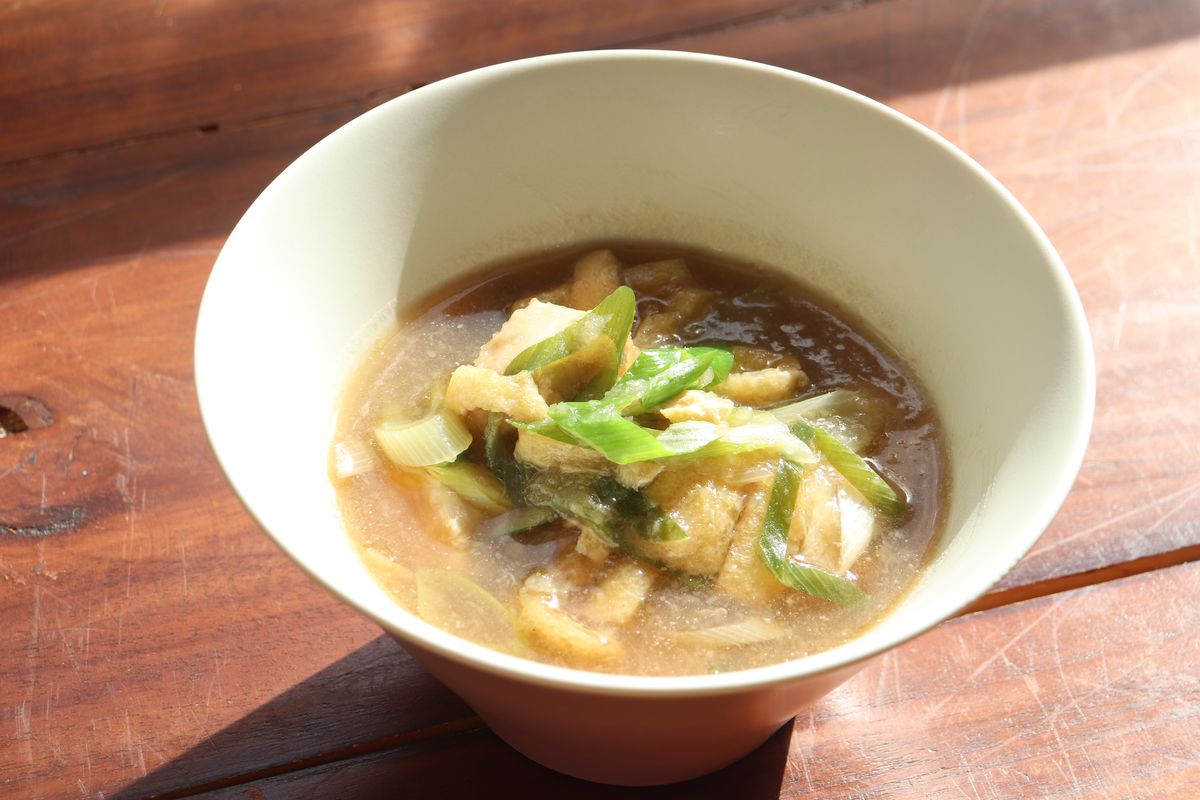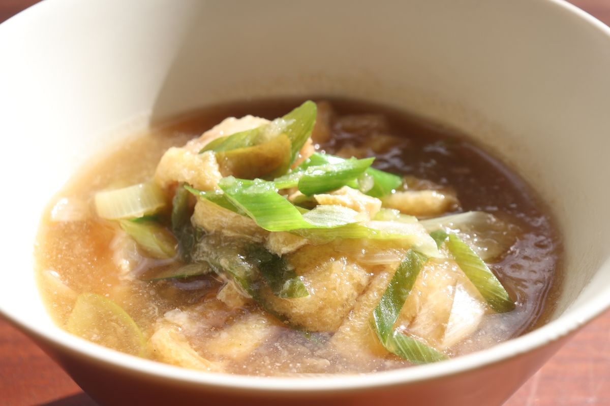 1.しいたけは石づきを取り、薄切りにする。長ねぎはスライス、油揚げは1cm幅の細切りにする