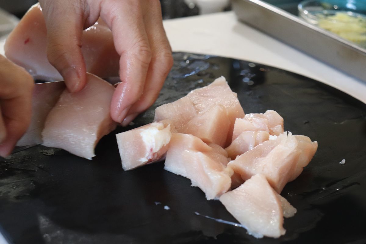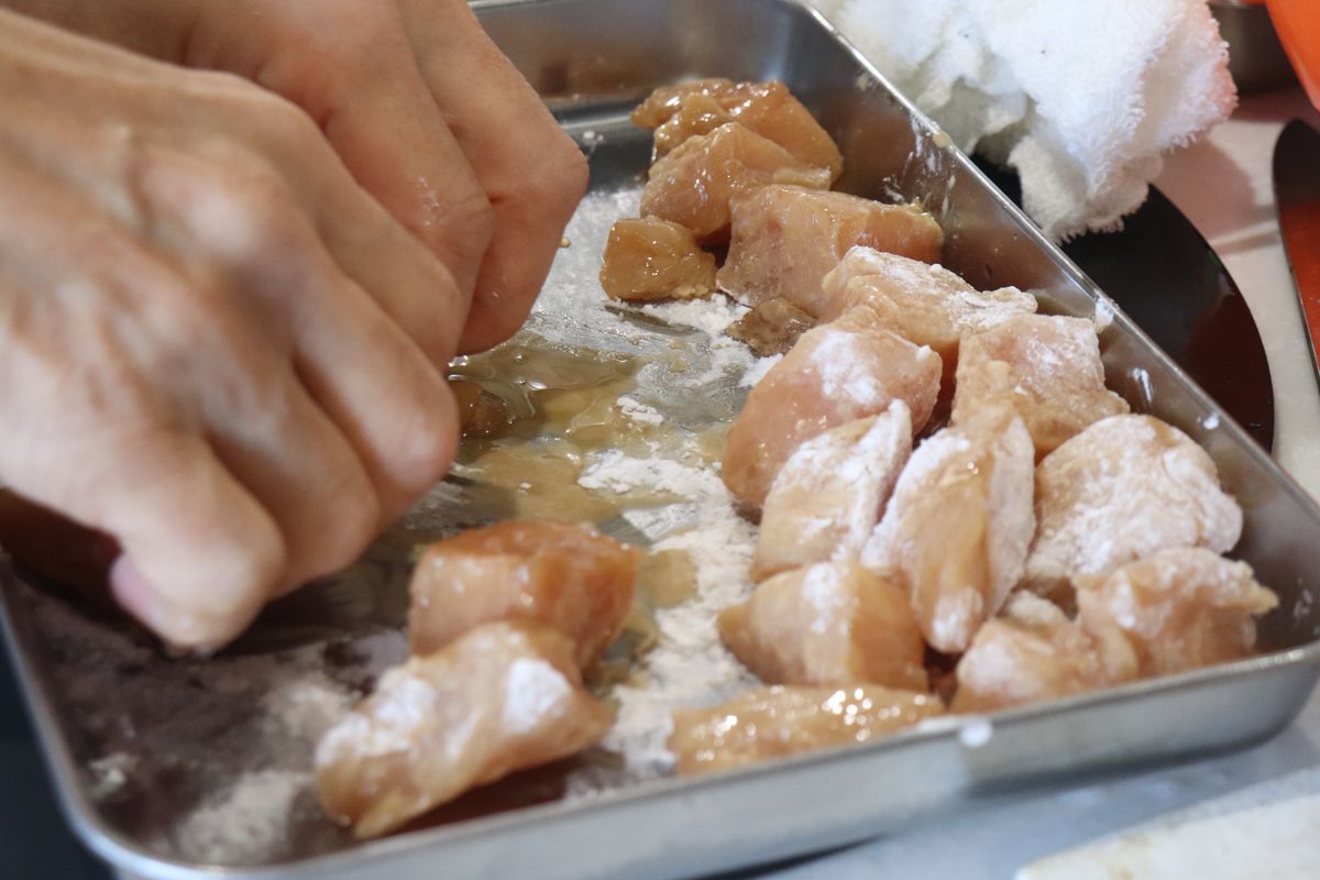 5.4で下味をつけた鶏肉に片栗粉をまぶす