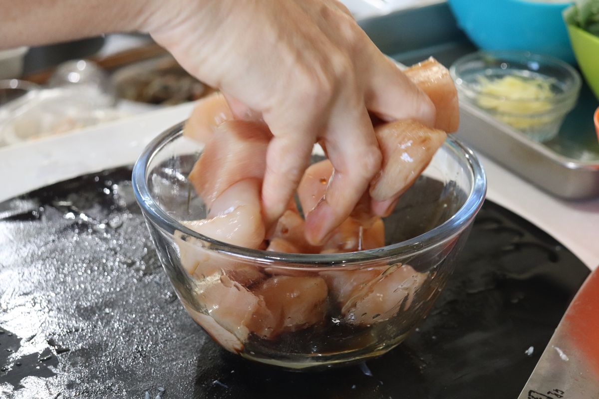 4.鶏肉に酒・醤油をもみ込み、10分ほど置く
