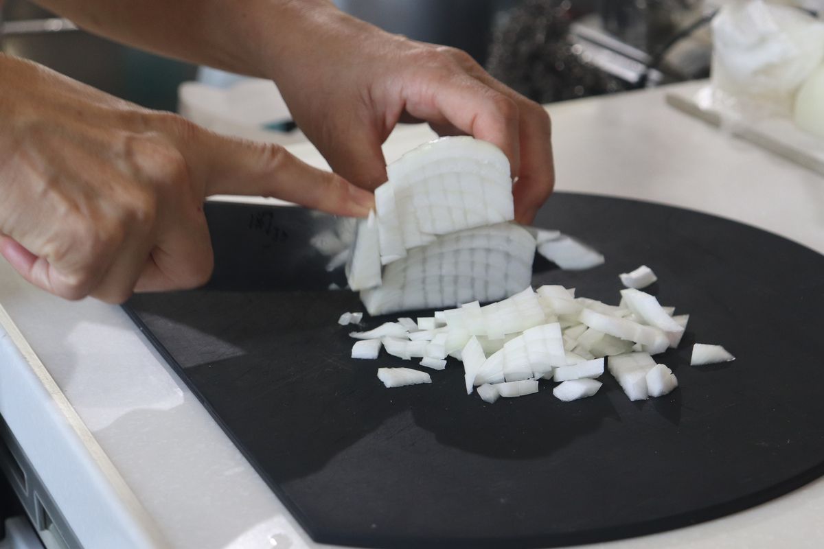 1.ソースを作ります。玉ねぎを1cm角に切ります