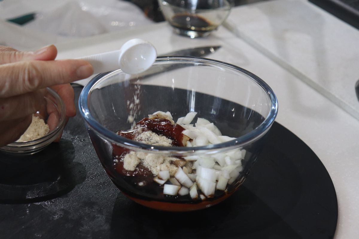 2.市販のミートソースのもとに切った玉ねぎを入れ、さらにケチャップ、ウスターソース、きび砂糖をいれ、よく混ぜる。