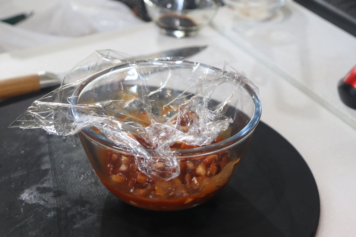 3.ふんわりラップをかけて、電子レンジで2分加熱する。これでソースは完成!