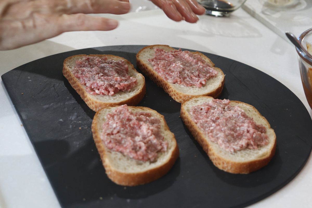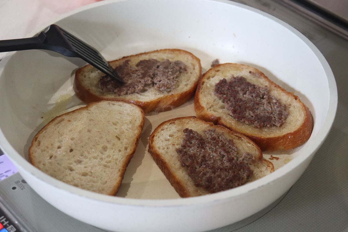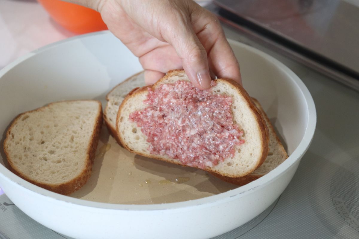 4.サンドイッチ用のパンを並べて、 合い挽き肉を均等に直接パンに塗ります