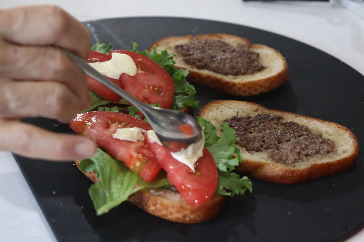 4.サンドイッチ用のパンを並べて、 合い挽き肉を均等に直接パンに塗ります