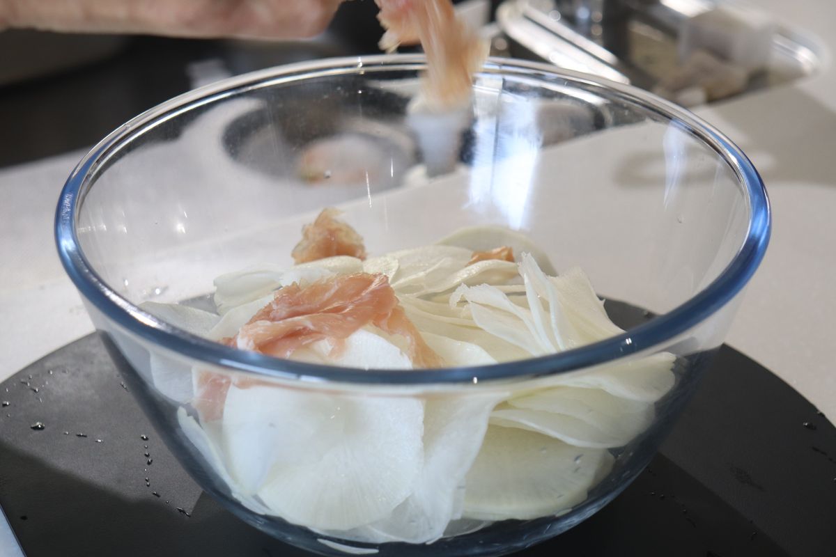 2.ボウルに大根と、ちぎった生ハムを入れる