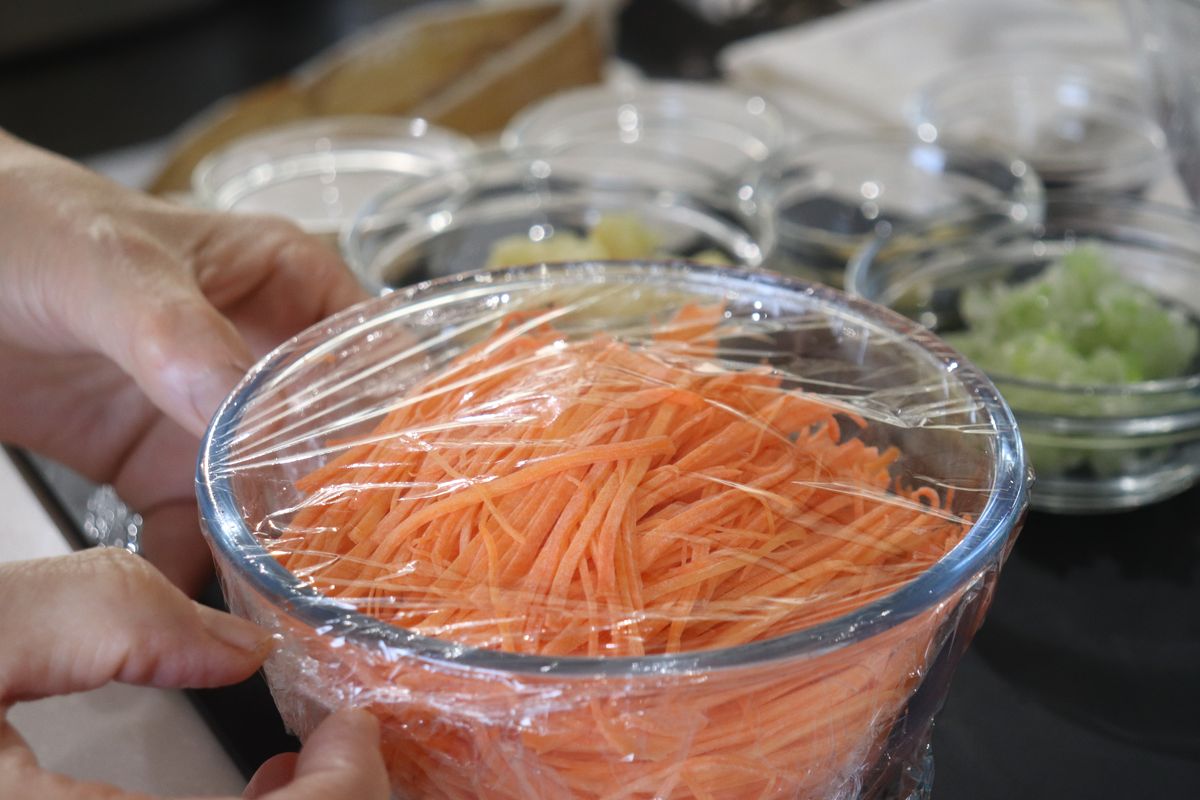 1. にんじんを細切りにする。耐熱容器に入れ、600Wで2分レンジにかけてしんなりさせる