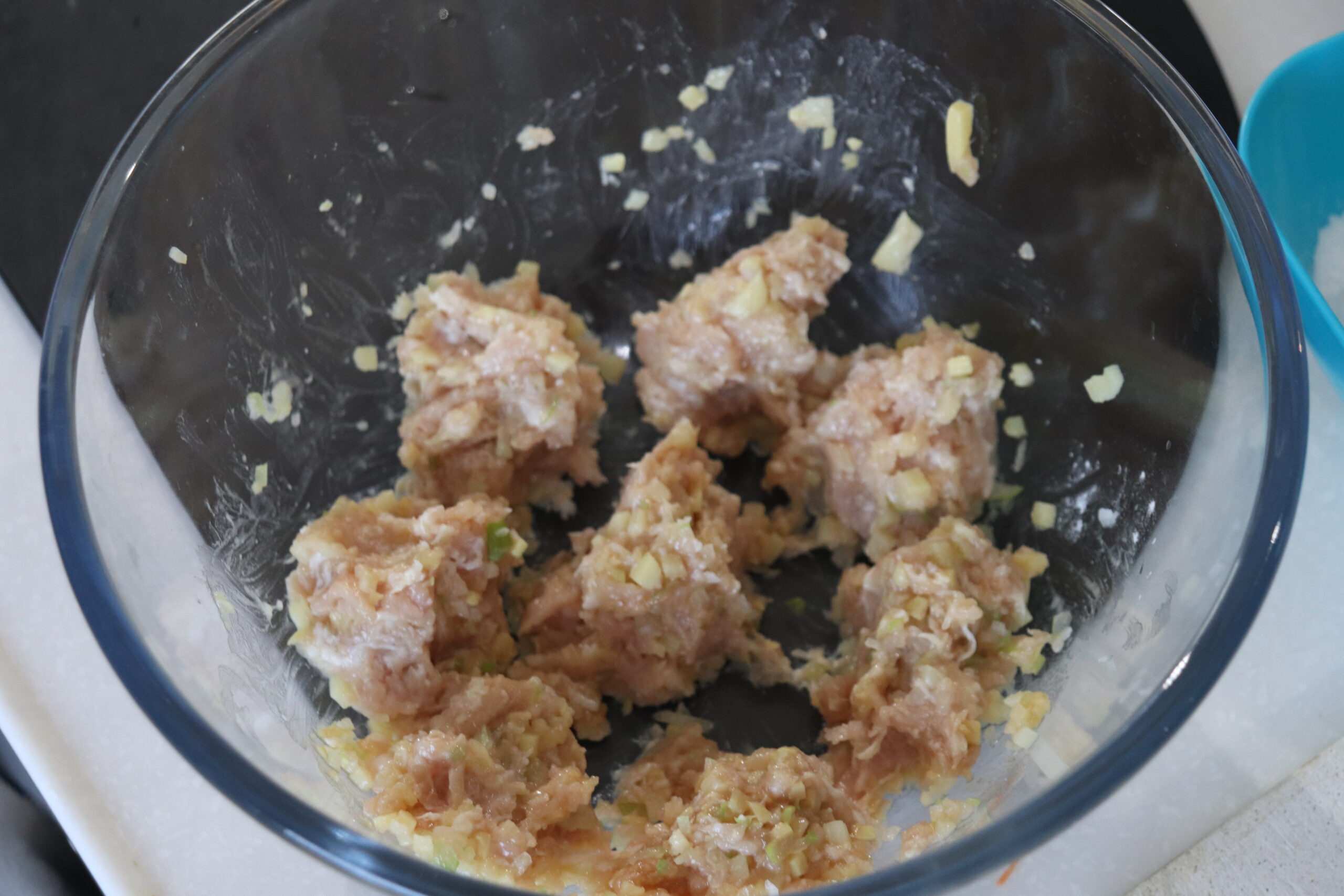 2.ボウルに豚ミンチを入れ、みじん切りにした長ネギ・たけのこ・おろし生姜・砂糖・オイスターソース・片栗粉・水(または酒)を加えてよく混ぜる