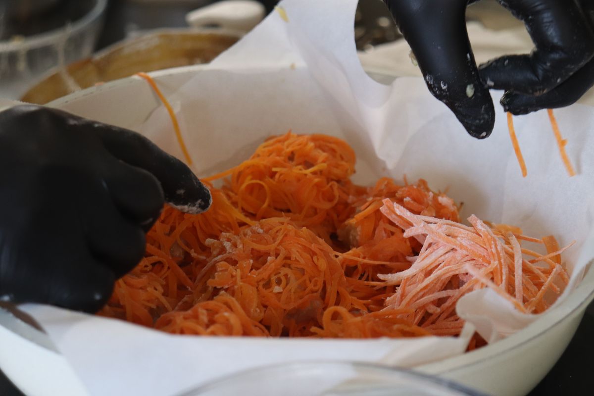4.フライパンにクッキングシートを敷く。切ったにんじんに片栗粉をまぶし、半分くらいのにんじんをフライパンの底に薄く敷き詰め、その上にタネをのせる