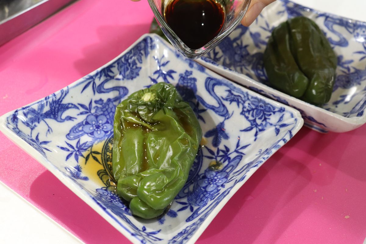 3.ピーマンをお皿にのせ、めんつゆ、かつお節、お好みでからしを器に添えたら完成!