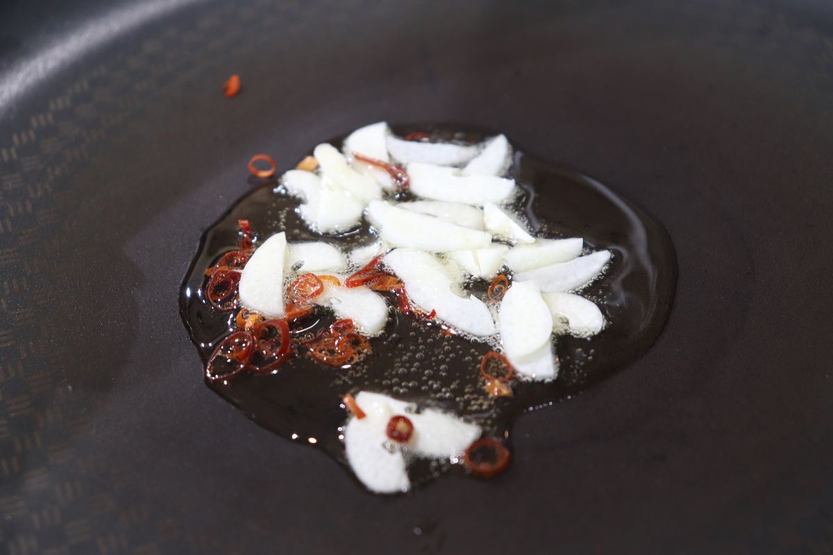 5.温める前のフライパンにサラダ油を引き、カットとしたニンニクを入れて弱火にかける。ニンニクのまわりから泡が出てきたら赤唐辛子を入れ、ニンニクがきつね色になるまで炒め、香りを引き出す。