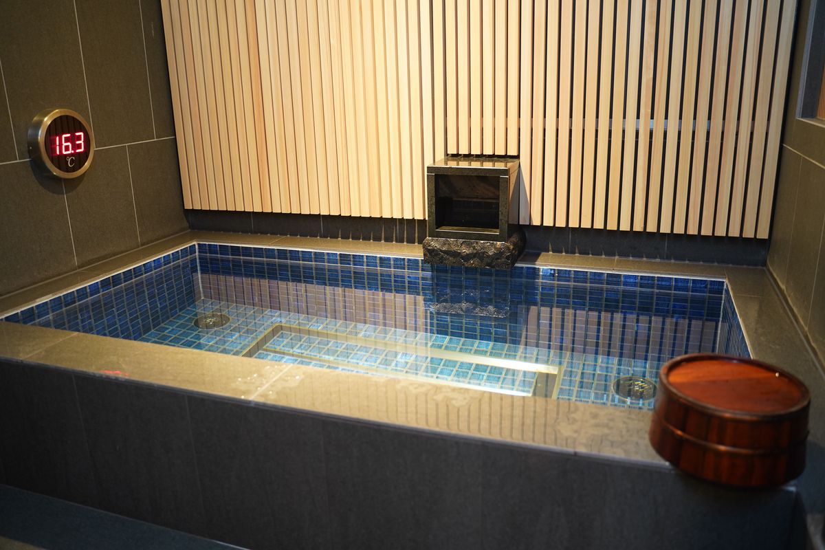 そしていざ浴室へ。今回は「田~DEN~」を撮影させていただきました。入ってすぐの場所にととのい椅子、奥に水風呂、そして右側にサウナ室というレイアウト。これらを時間内であれば独占できちゃうというのは、めちゃくちゃ贅沢だよなぁ…と驚きます。