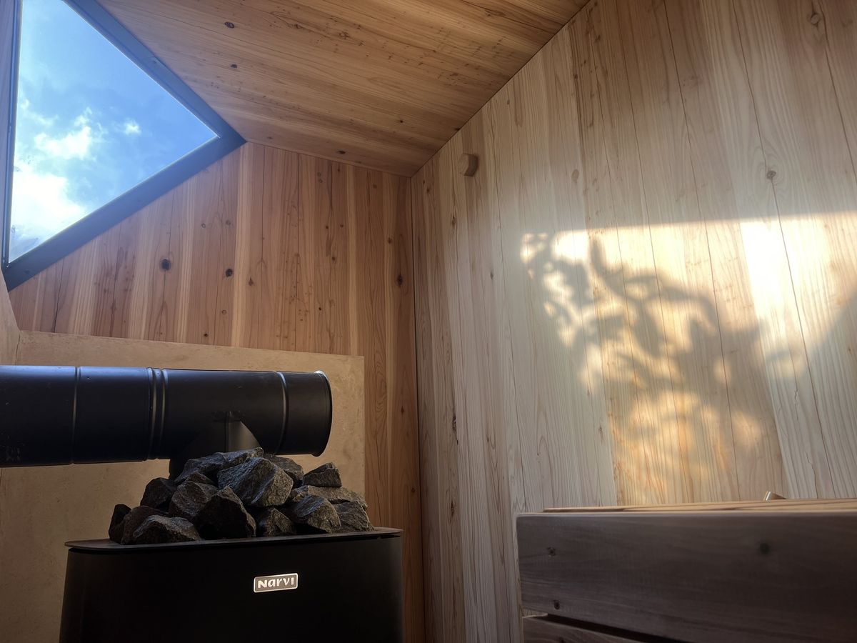 まず『LAMP豊後大野』。2024年、新たにトレーラーサウナ『Valo』(ヴァロ)を導入しました。フィンランド語で「光」を意味するこのサウナの最大収容人数は3名。フィンランド産の薪ストーブでしっかりとした蒸気を味わえることが特徴です。ストーブ上部には三角の窓があり、心地よい陽光が降り注ぎます。こぢんまりとしたサウナなので、お友だちやカップルで利用するのがオススメです。