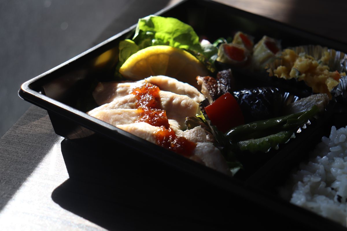 「窓の月弁当をうま塩メニューで!」と伝えると、食の健康応援団の基準に沿った仕様で作っていただけます。メインは、しっとりとした鶏ハムに葱ソースをかけた一品。