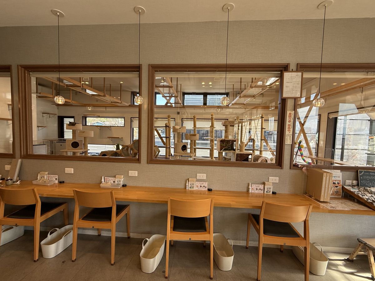 木のぬくもりを感じる店内には、テーブル席のほか、ネコたちを近くで眺められるカウンター席も用意されています。このカウンター席が実は人気。食事をしながら、すぐそばをネコが通り過ぎていく…そんな何気ない瞬間も、このお店ならではの魅力です。
