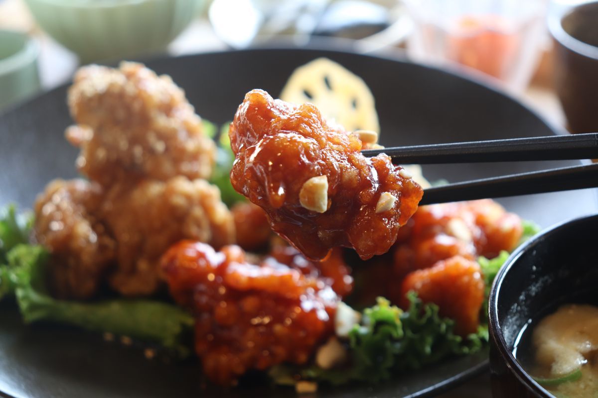 韓国風の味付けのチキン、ピリ辛でおいしい!
