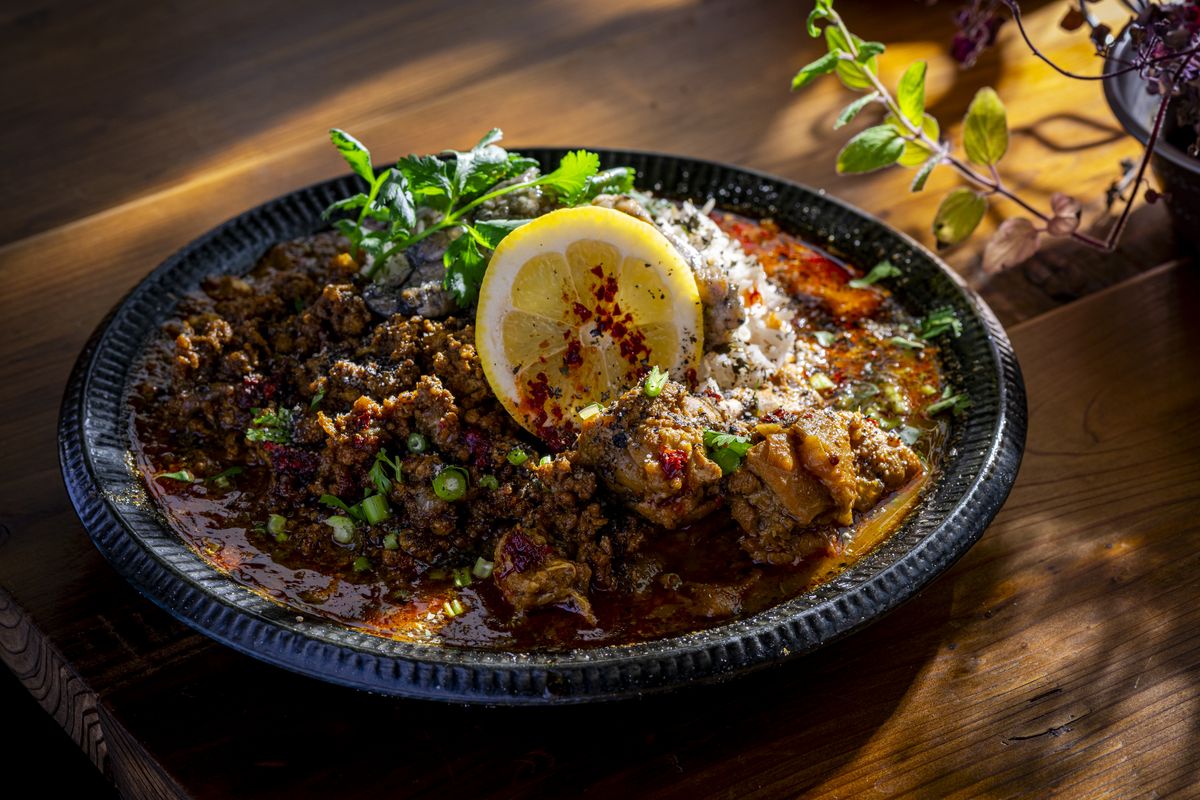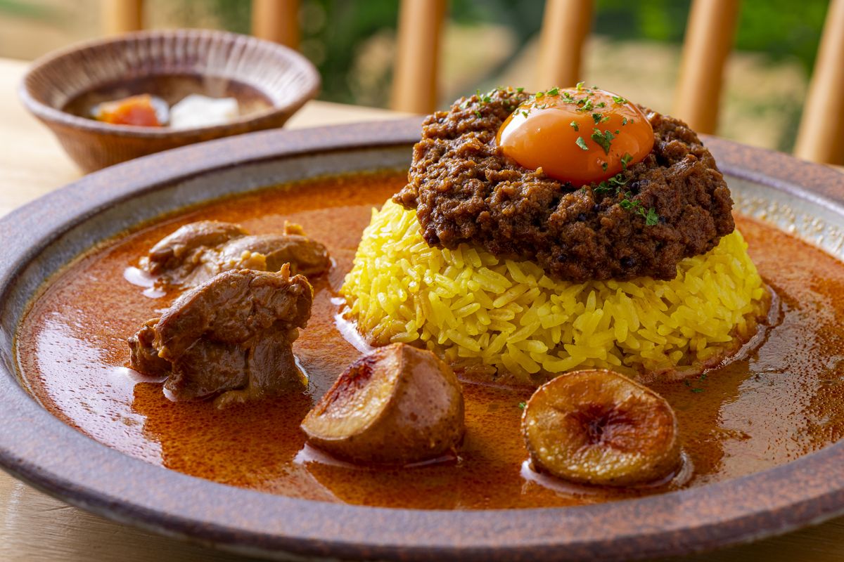 ひとつのお皿に複数のカレーソースをかけて楽しむ“あいがけ”カレー。こちらのお店では、インド洋に浮かぶ小さな島国の刺激的な味わいと、心落ち着く和の風味の融合を楽しめるワンプレートが人気を集めています。スパイシーでありながらも、ココナツミルクのまろやかさが際立つスリランカカレーの海に堂々と鎮座するのは、しょうゆやみそをはじめとする、なじみの調味料で優しく仕立てられたひき肉たっぷりのキーマ。艶やかな黄身と一緒にその塔をそっと崩し、好みのままにどうぞ。