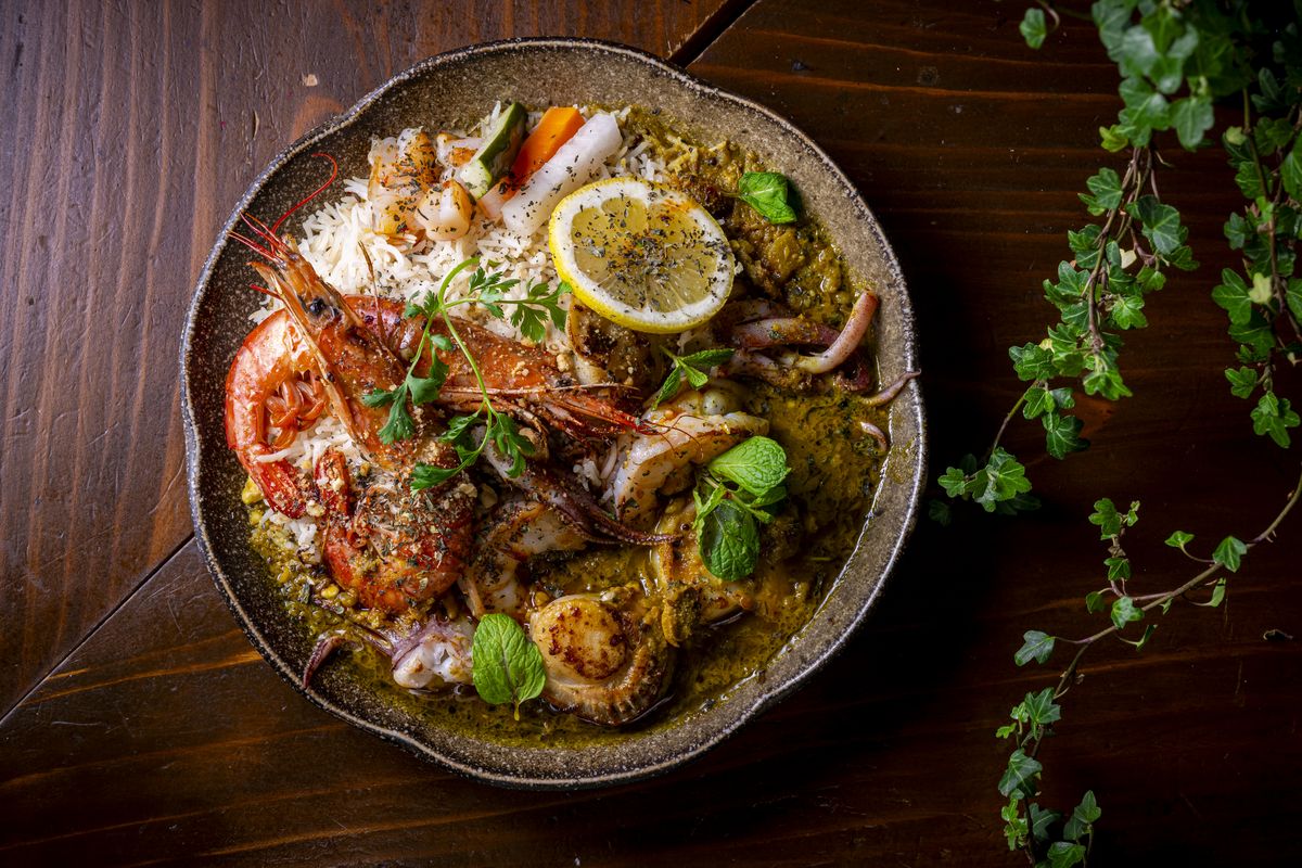 日替わりのカレーは1700円~(価格は食材により異なる)。写真の内容はエビの殻をいり、オイルにその旨みを移したグリーンカレー