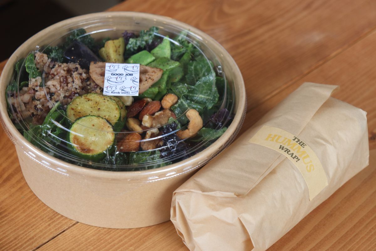 「ケールとキヌアのサラダ」1200円と「フムスのラップサラダ」700円