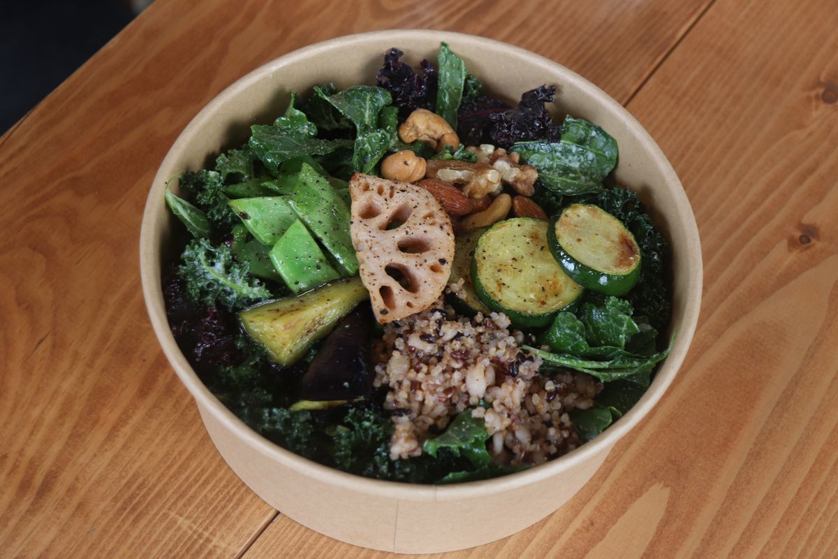 3種類のケールをベースに、モロッコいんげん、れんこん、ズッキーニ、なす、キヌア、ナッツと、具材がたっぷり詰まっています。中央にあるれんこんはカリッと揚げられており、ケールと一緒に食べるとさっぱりしておいしい!