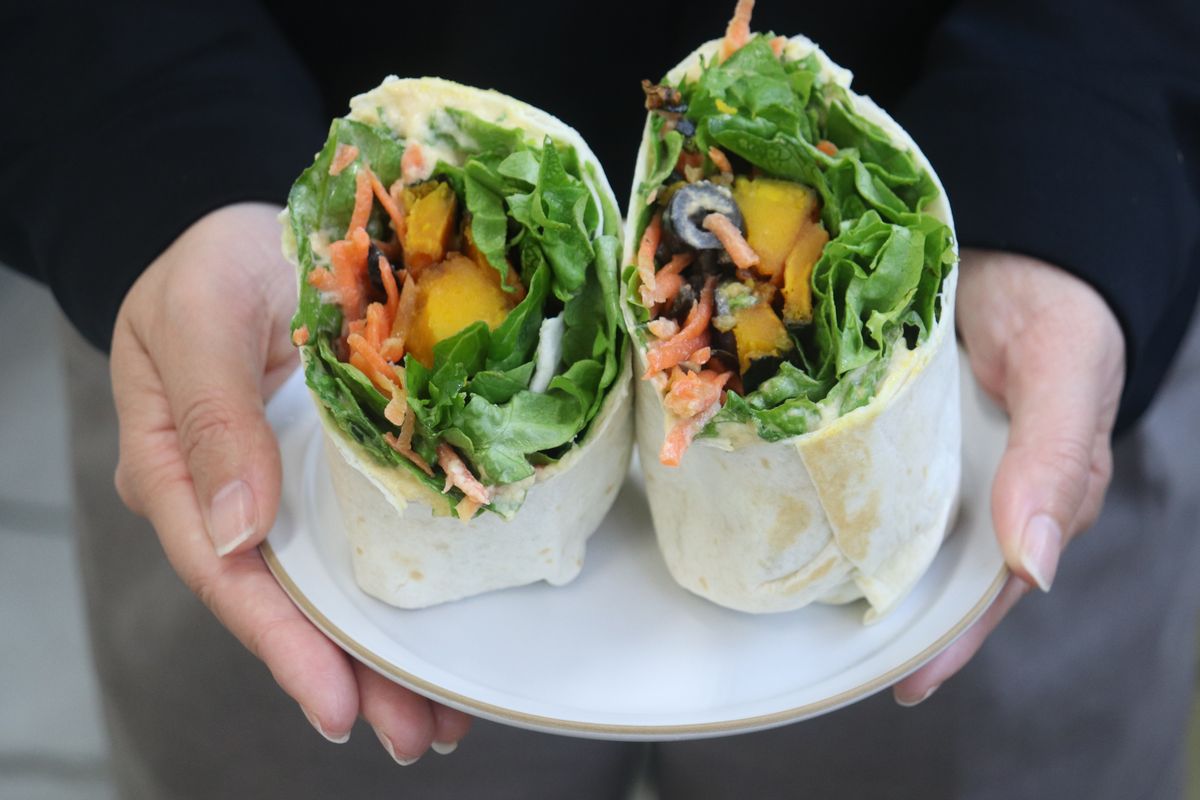 野菜とフムス(ひよこ豆のペースト)を包んだラップサラダは、手軽に食べられるのが魅力。