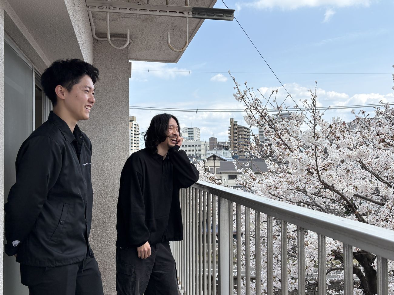 満開の桜をベランダから眺められる希少な物件をセレクト。福田さんらしい感性で、桜をモチーフに独創的な世界観に仕上げてほしいとのオーダーをしました。この日は桜が満開! 「どんな部屋になるか楽しみ」と『テラスバ』賃貸課の佐々木さん(写真左)