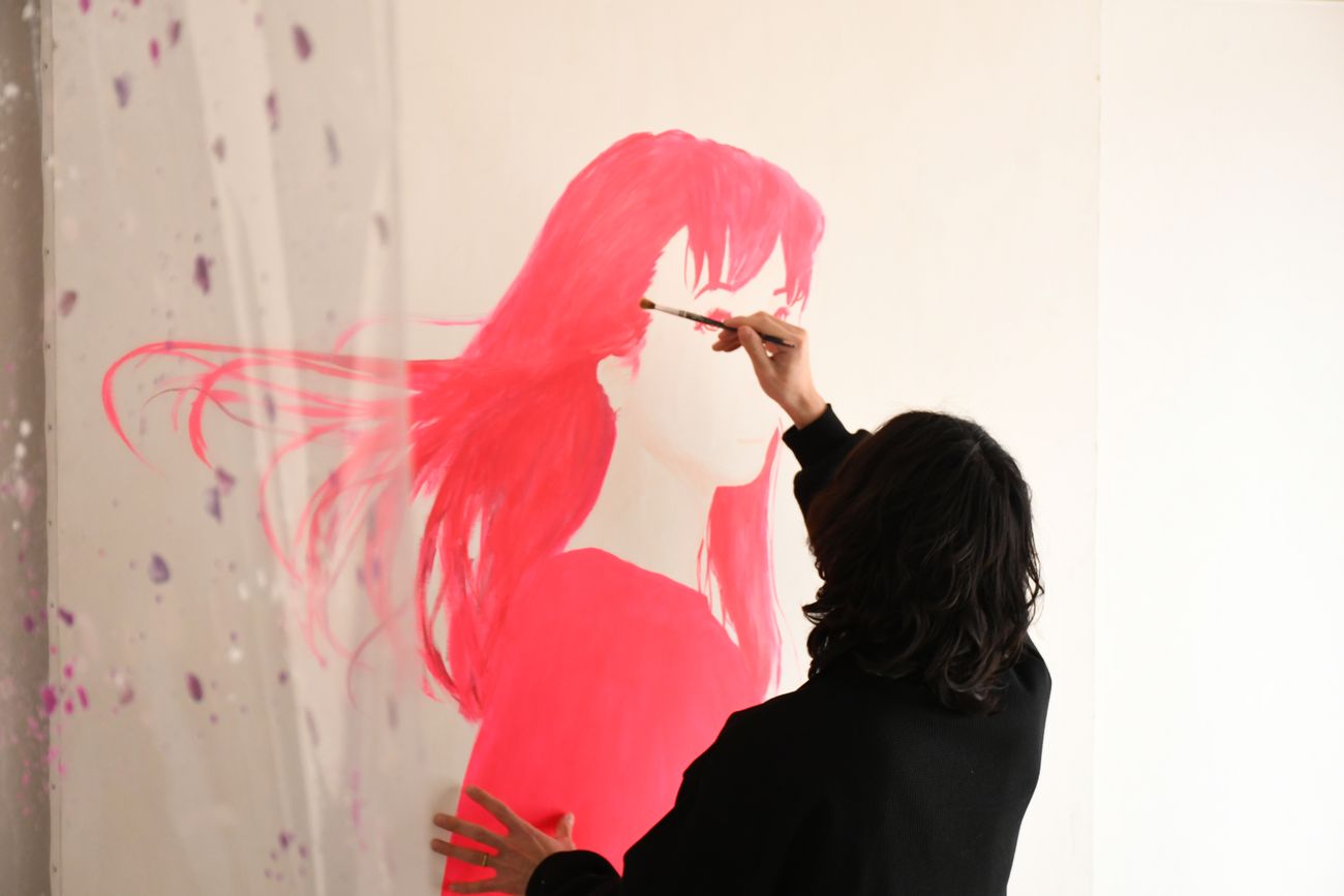 春風に髪をなびかせる女性の絵を中心に、何層にも重ねた透明なシートに桜の花びらを描きました。透ける花びらが光を受け、ゆらゆらと部屋に浮かぶ。