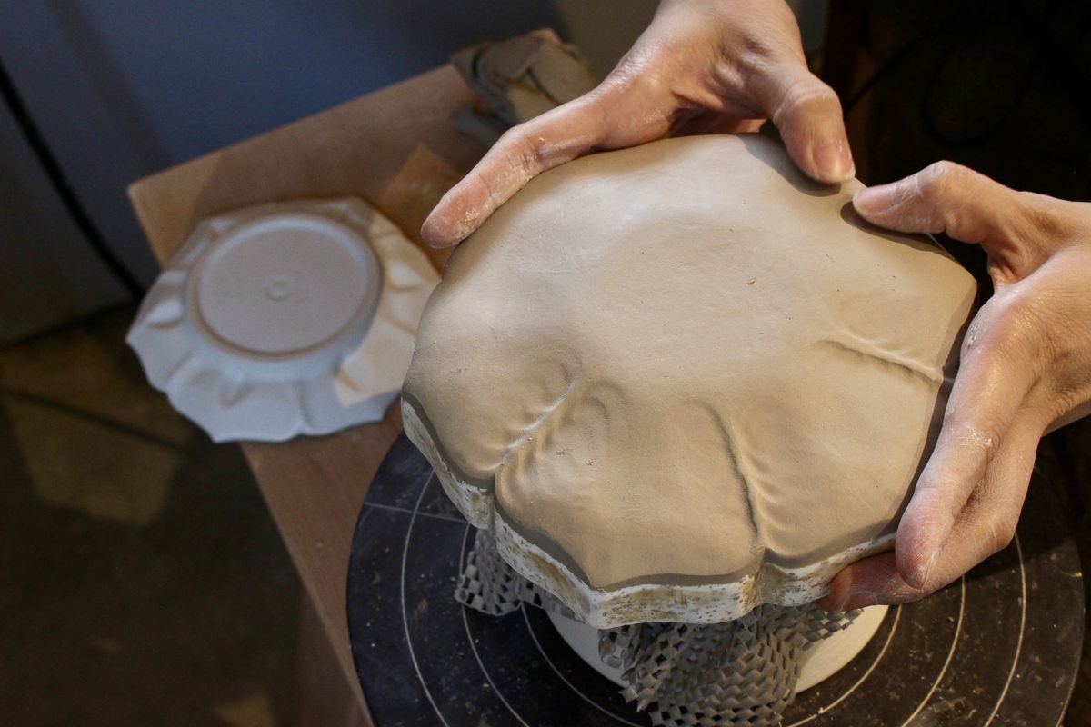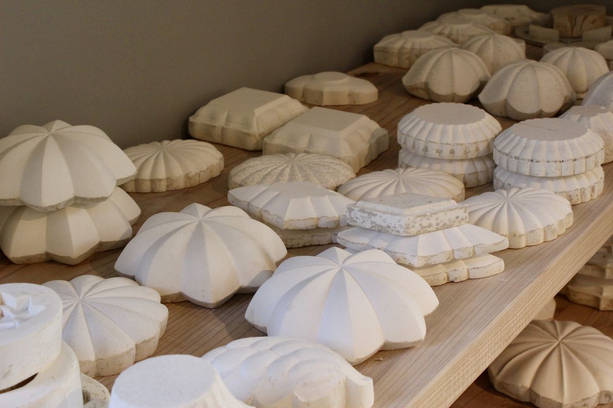 ギャラリーと喫茶室を堪能したあとは、奥の棟にあるアトリエの見学へ。臼杵焼は、石膏でできた型に粘土を乗せて形作る「型打ち」という技法で作られています。