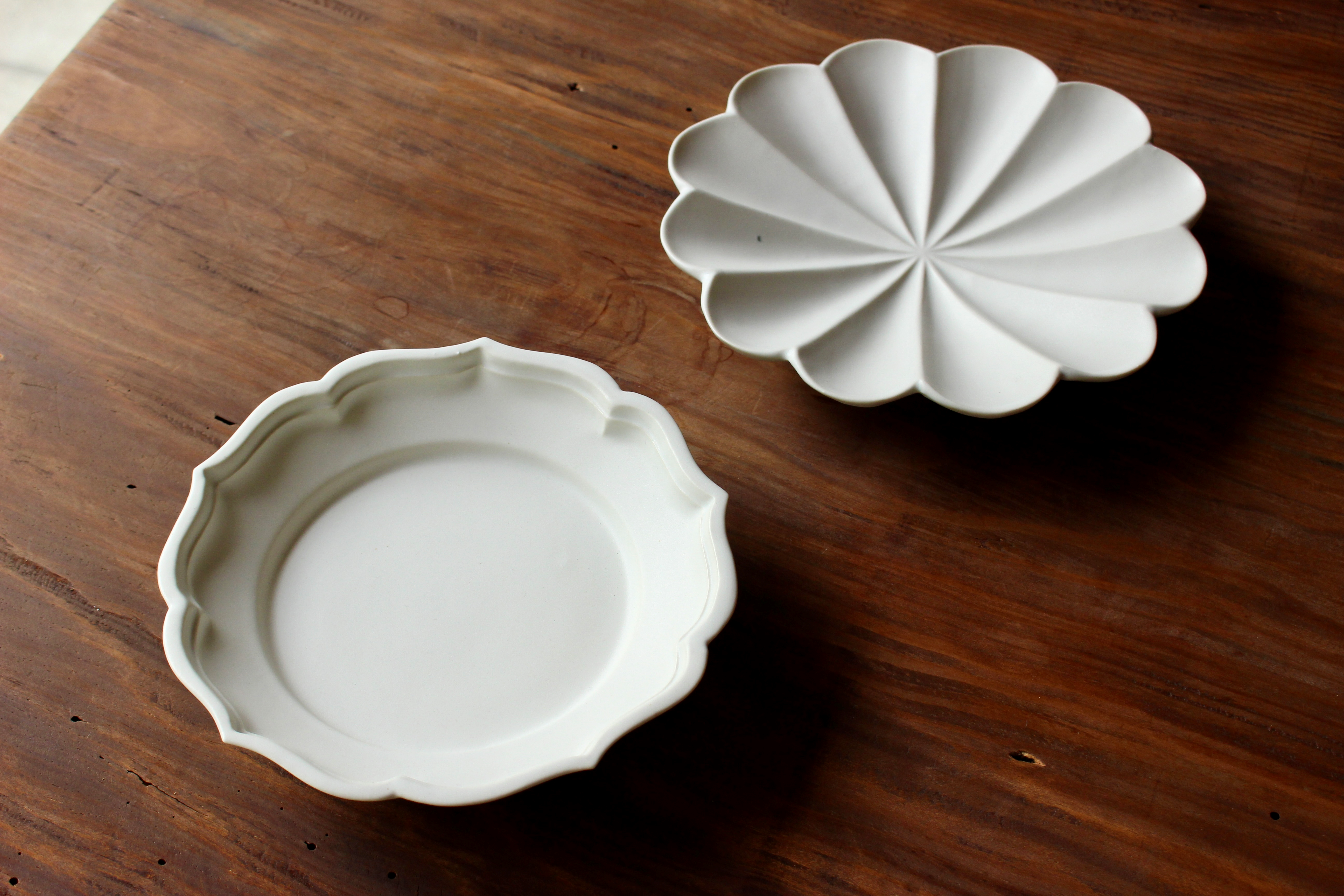 右奥が「輪花」シリーズの浅鉢7150円、左手前が「稜花」シリーズのリム皿5500円