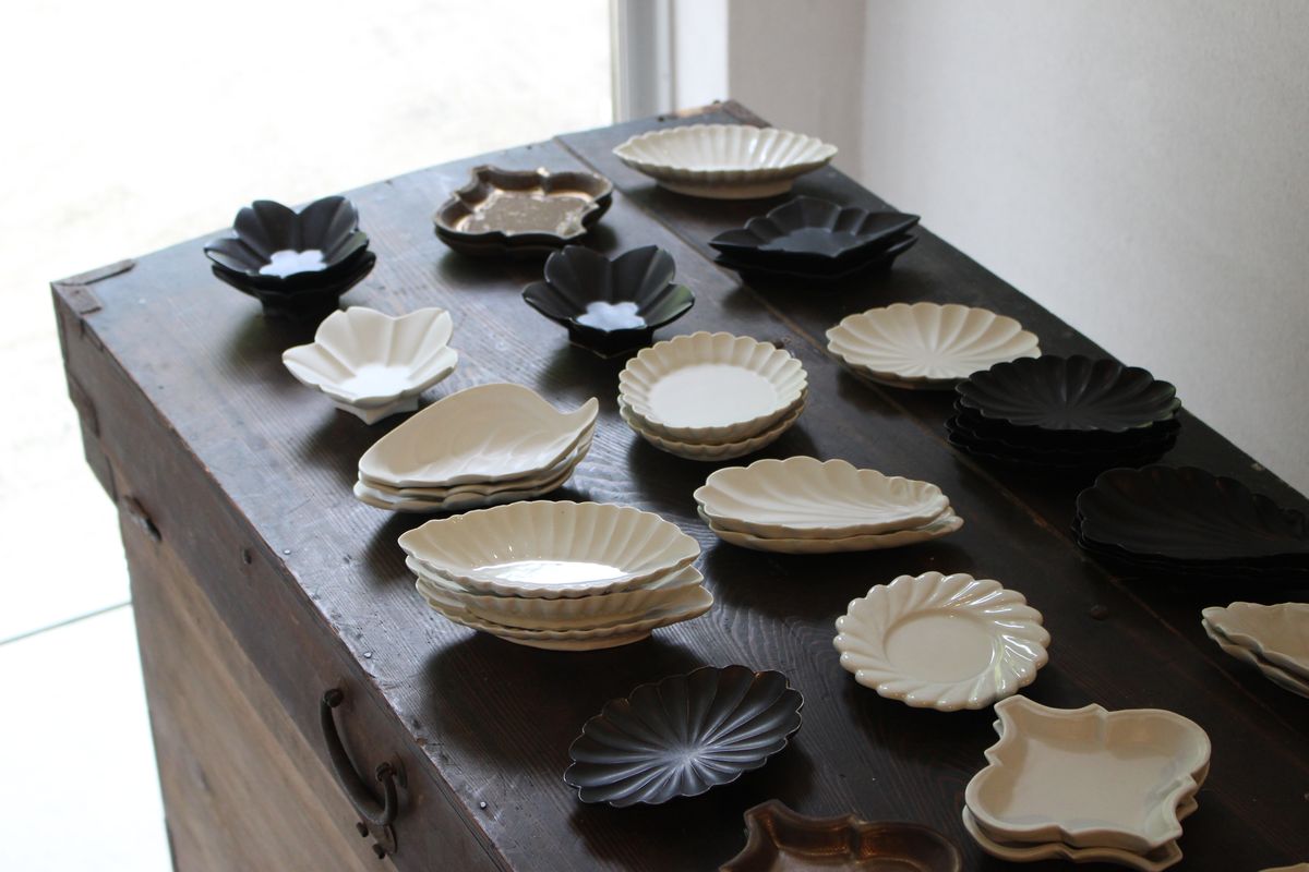 花の形の末広焼作品や臼杵の自然から着想を得た「輪花」「稜花」「菊花」シリーズを中心に、洗練されたシェイプが印象的です。